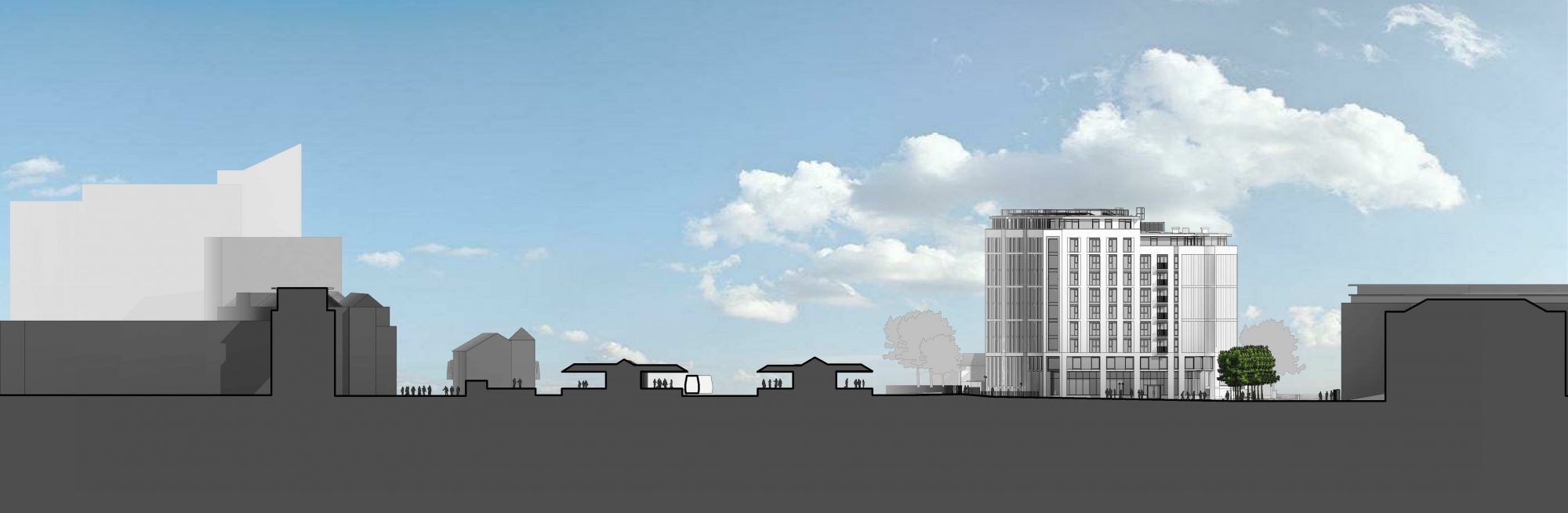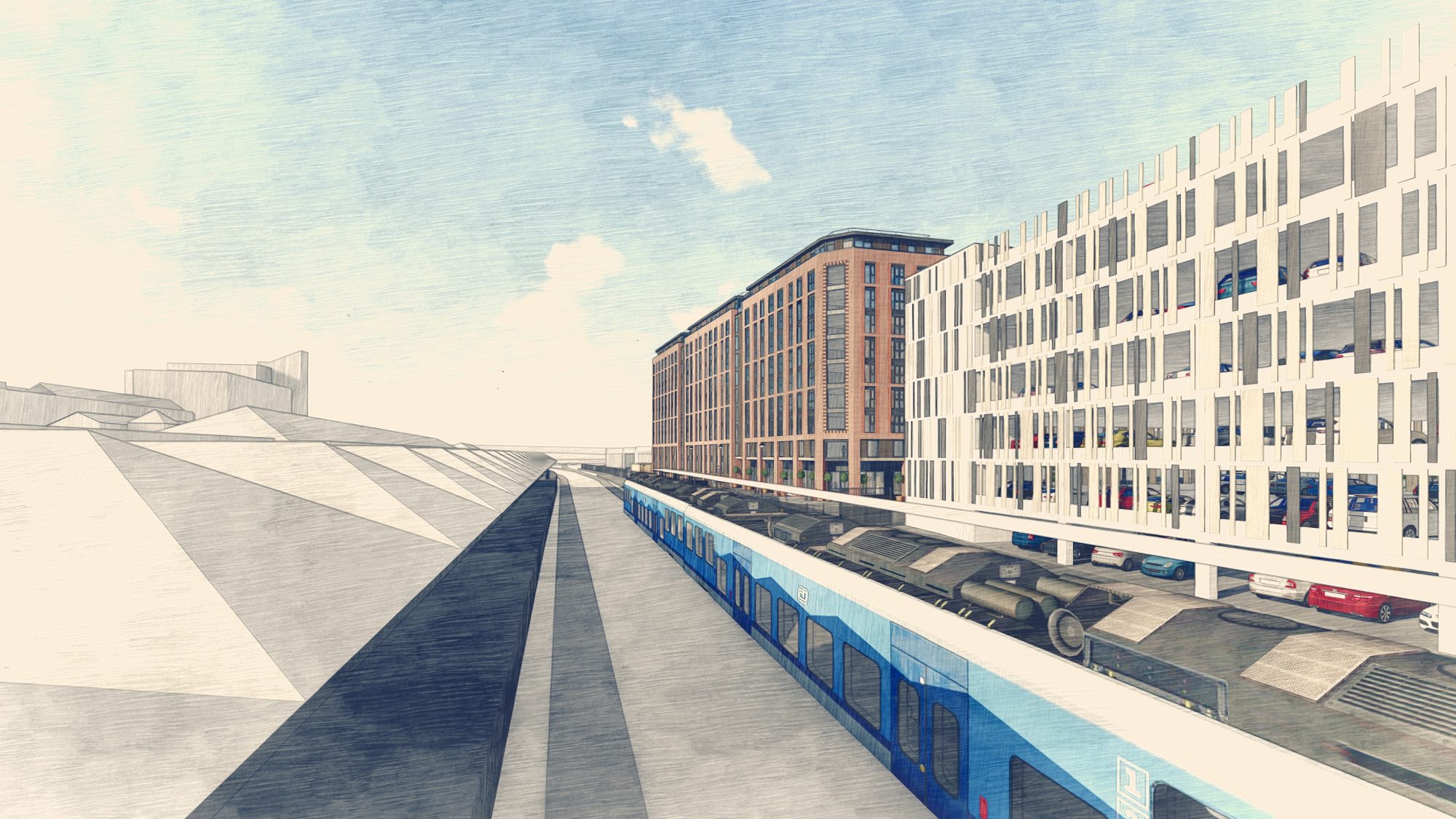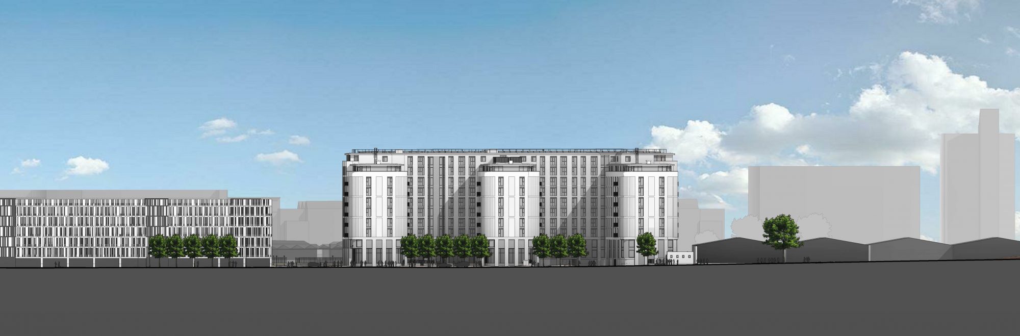 Queen’s Road is a new PRS scheme by Blocwork, a joint venture between Network Rail and Bloc Group. The building is 9 storeys including a split ground floor, with 1 additional mezzanine level covering half of the footprint above a lower ground car park level. The ground floor is dedicated to communal use. An active frontage will provide a sense of safety and wellbeing, and include facilities such as a resident’s lounge, private dining room, a gym for residents and a commercial unit.