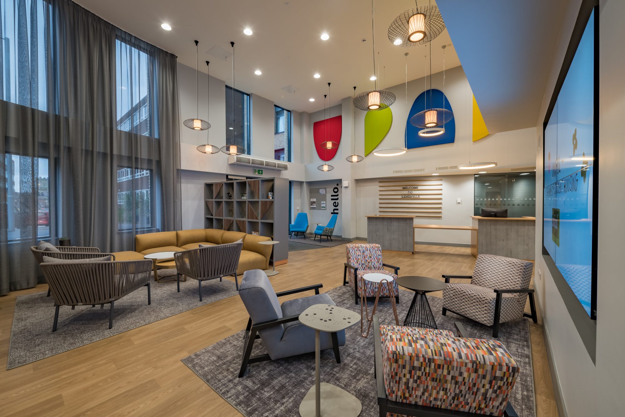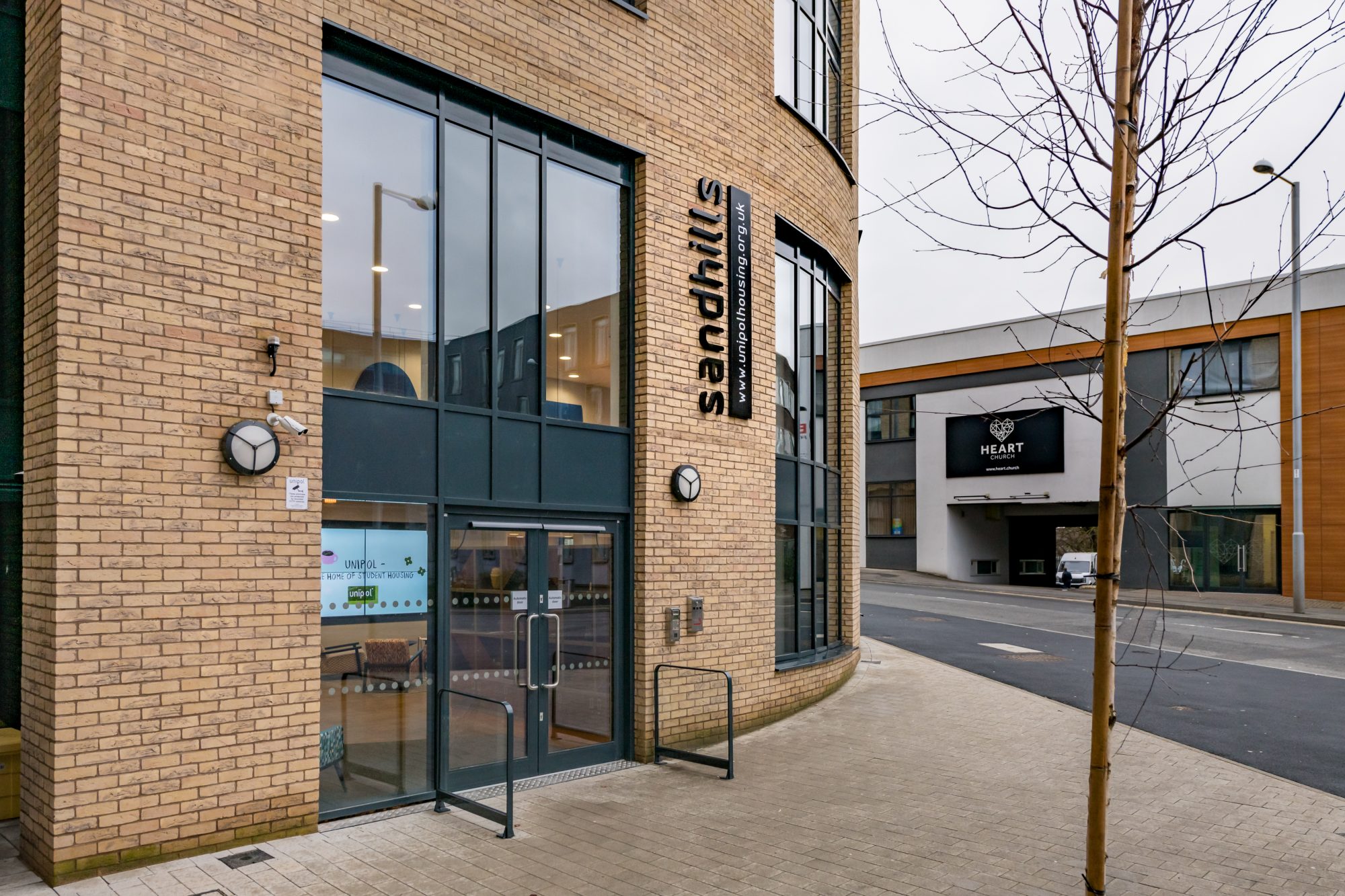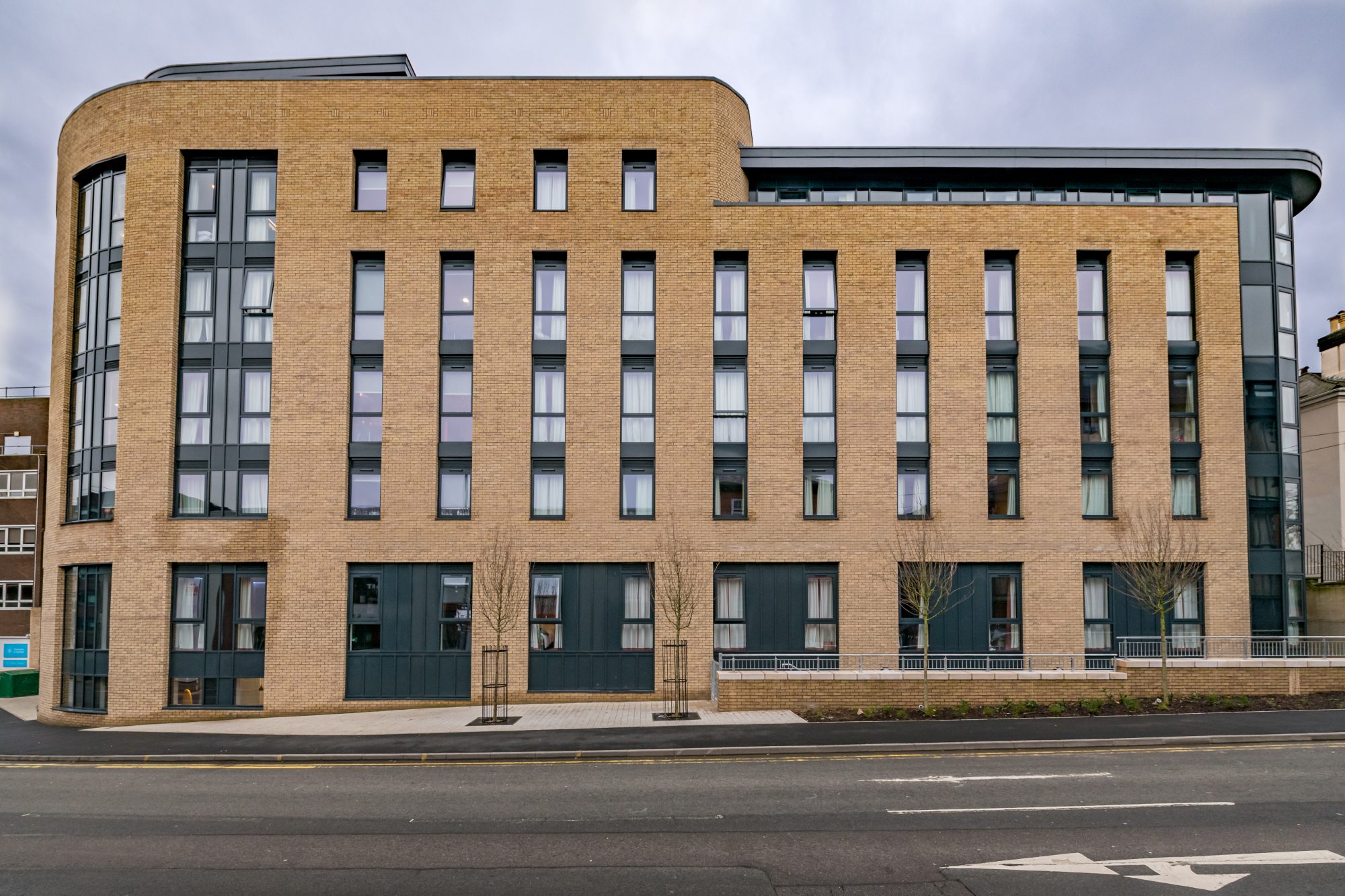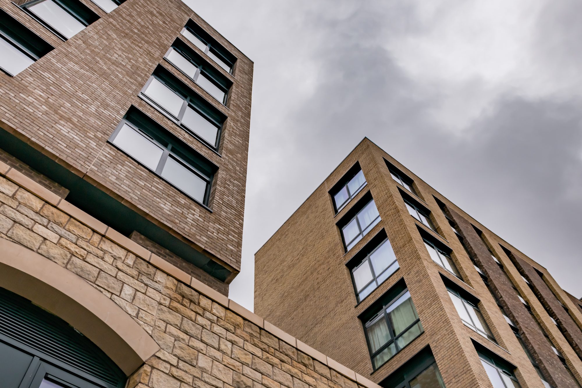 The accommodation is situated over 9 storeys, in two blocks which share a Front of House area, including meeting rooms, lounge areas and a demonstration kitchen. The building is a steel framed structure, with concrete floors. The external walls are clad in cream, buff and brown bricks, with dark grey windows and curtain wall.