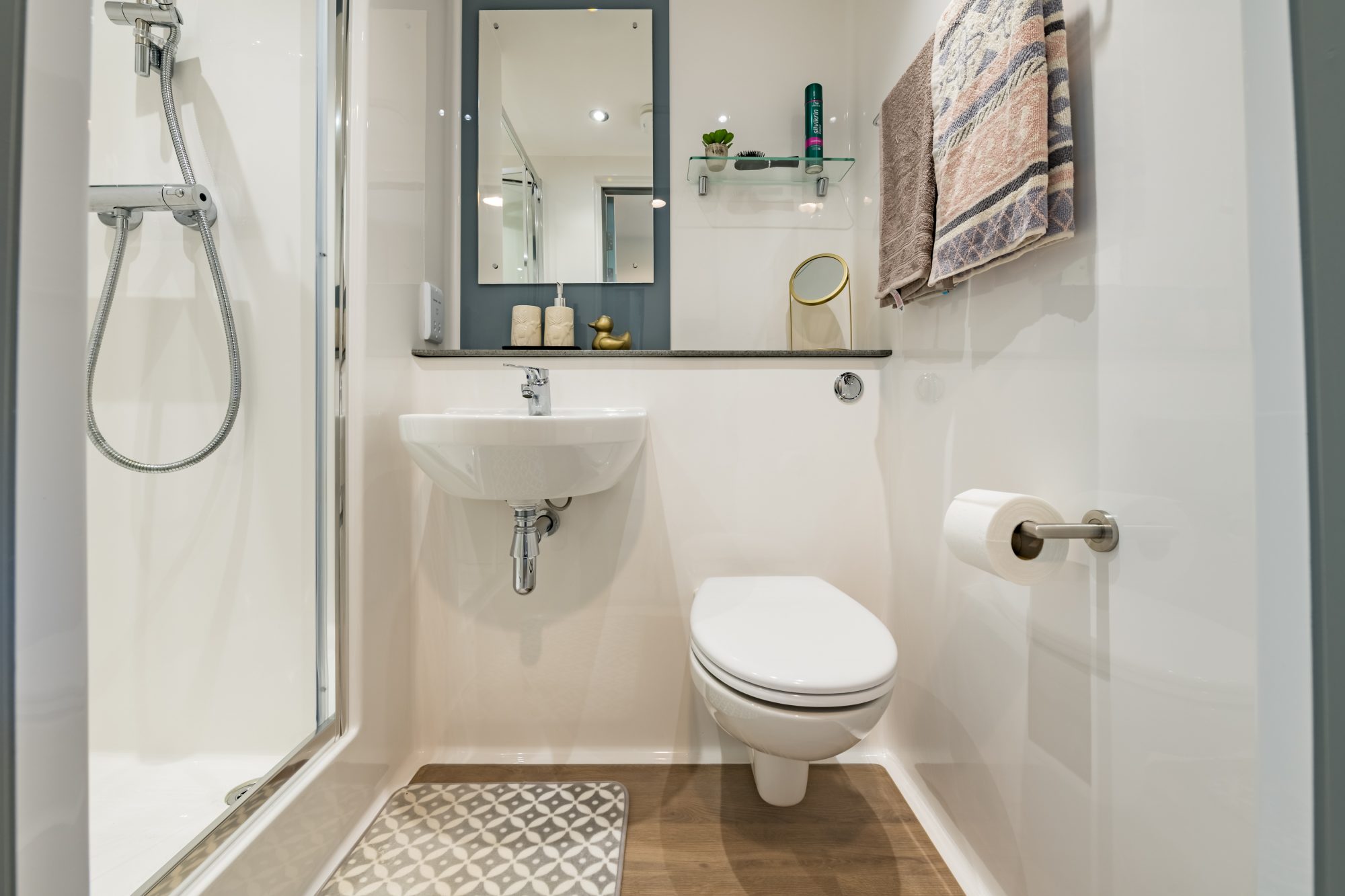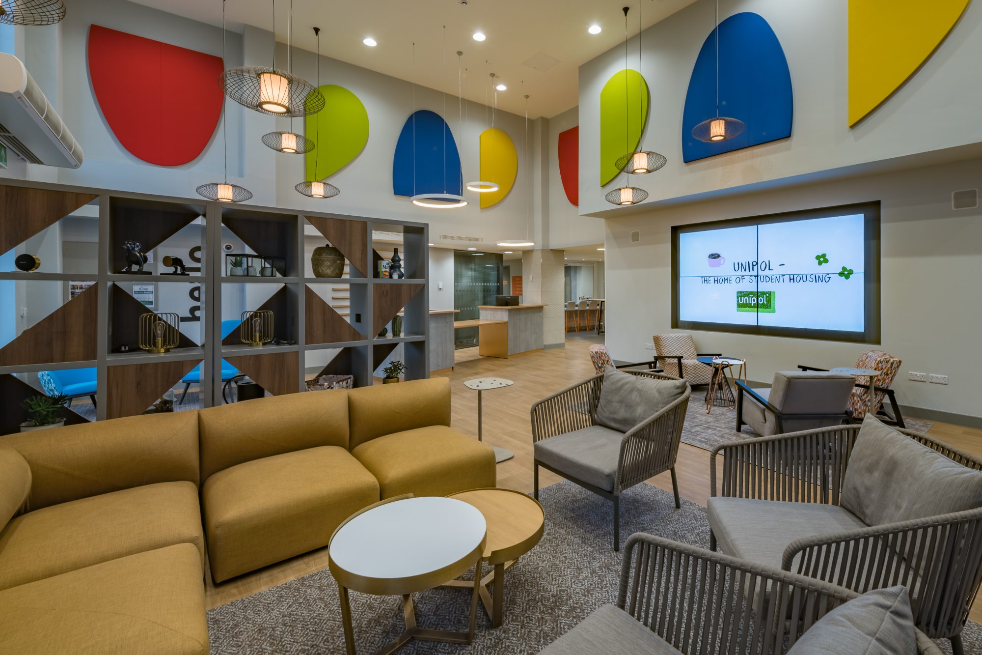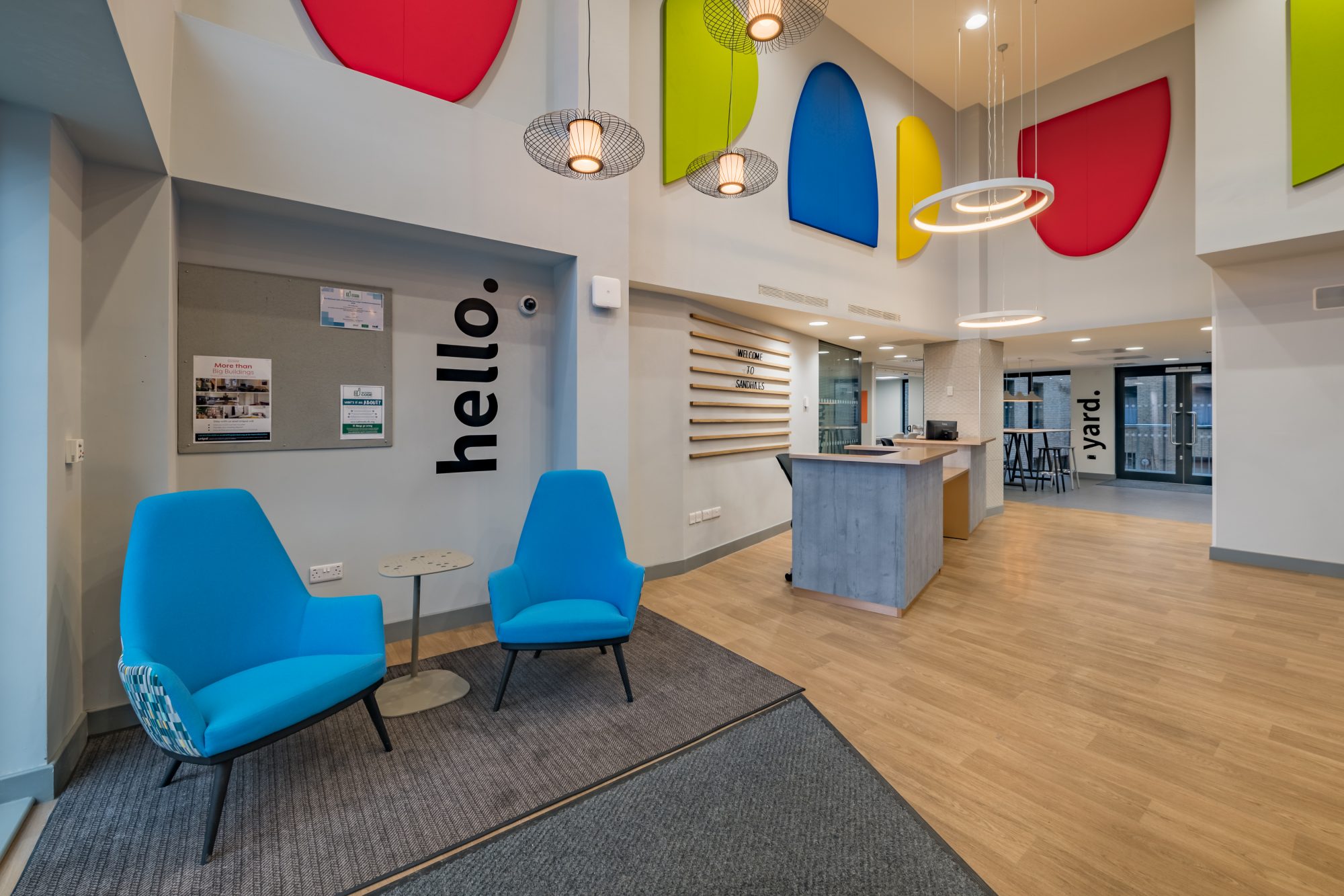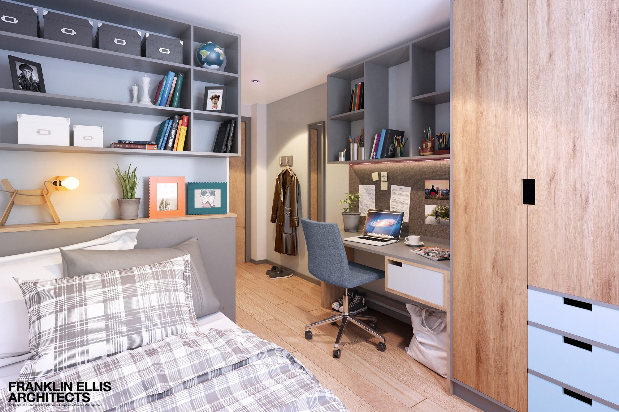 The accommodation is situated over 9 storeys, in two blocks which share a Front of House area, including meeting rooms, lounge areas and a demonstration kitchen. The building is a steel framed structure, with concrete floors. The external walls are clad in cream, buff and brown bricks, with dark grey windows and curtain wall.